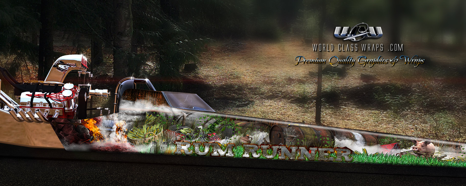 This entertaining nostalgic theme has a Hillbilly feel about it, and is a split panel full dragster wrap. The details are lifelike and the imaging is bright, crisp and clear. Title on the side is for this showing, however can be changed to one you may have in mind, or removed all together. There are larger preview images to see of this mural by clicking the tab just a bit further down this page.