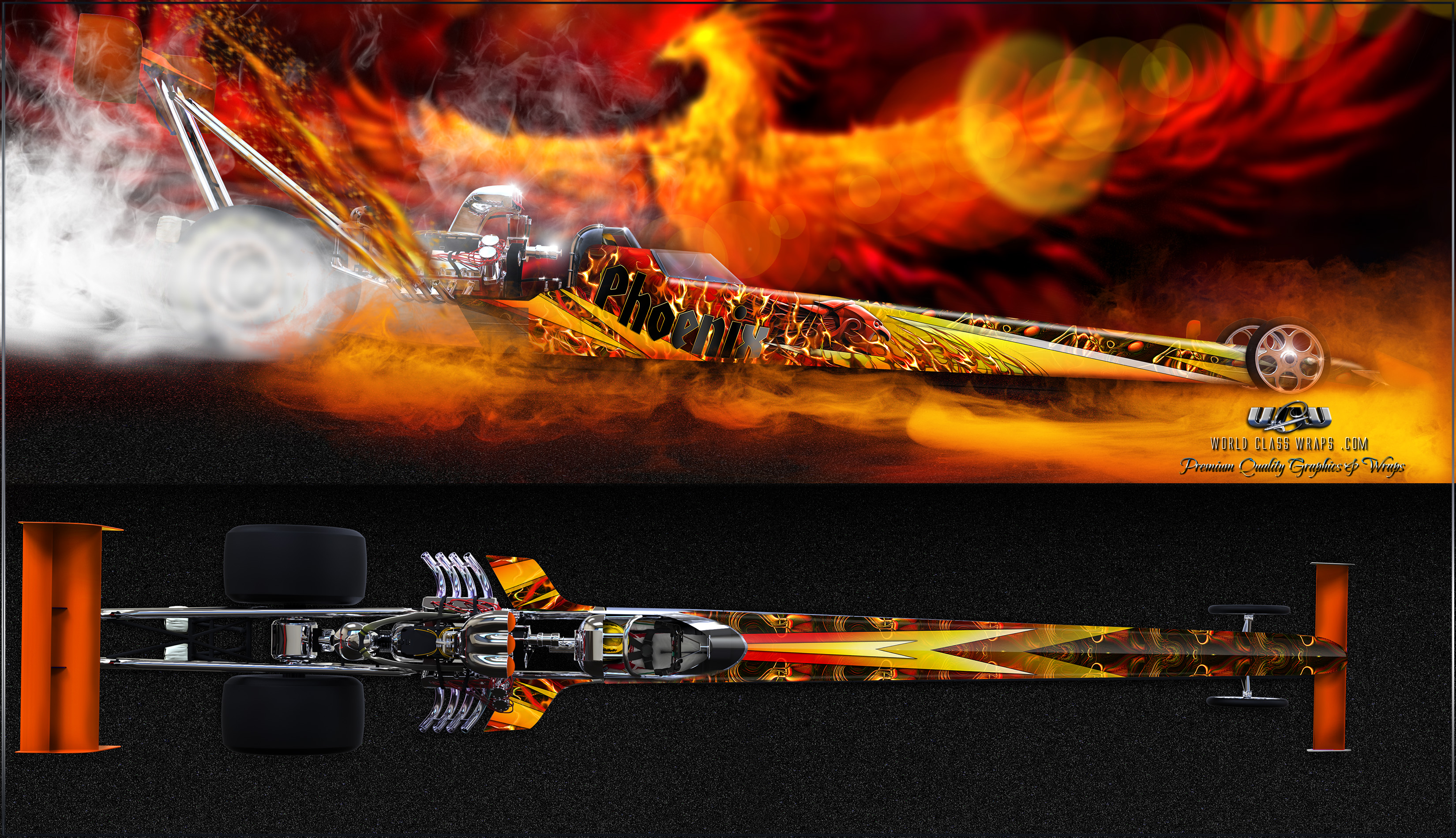 This is the mythical Phoenix dragster wrap with all its glorious embellishments. This wrap is bright, even brighter yet under sunny skies. Every square inch is buffed beyond perfection in order to maintain it's earned status. It's built up from a composition of metallics, gradient overlays, digitally air brushed rich flames with sporadic yet sharp geometric accenting. The title along side the design is optional, and the overall look is powerful, all while maintaining a distinction like none other.