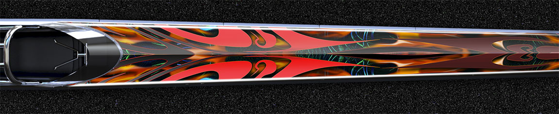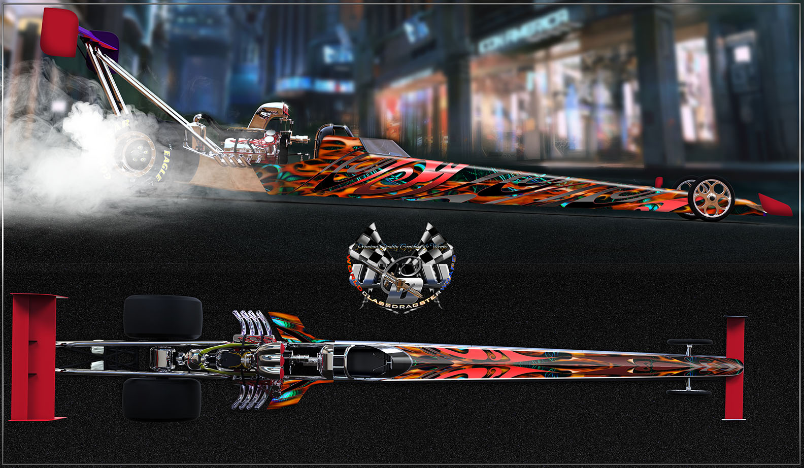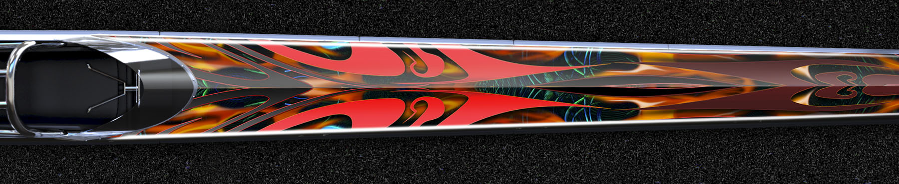 This brightly colored dragster wrap theme can be generated in other colors, along with the addition (or omission) of a custom title down the two sides as seen here by example.